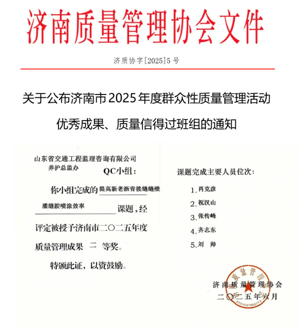 近日,在山東公路學會組織的“2025年度全省交通行業質量管理小組”和濟南市質量管理協會組織的“濟南市2025年度群眾性質量管理活動優秀成果”活動中,公司海闊天空QC小組、養護總監辦QC小組、凌云QC小組相繼榮獲“全省交通行業質量管理小組”和“優秀質量管理小組成果”榮譽稱號。