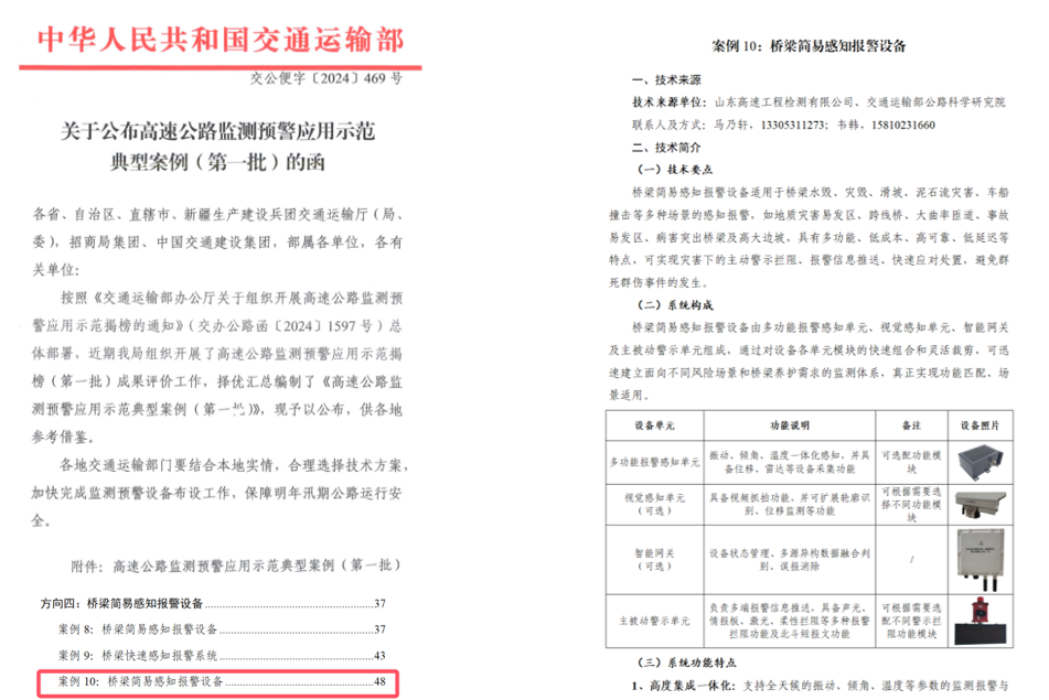 工程咨詢集團權(quán)屬山高檢測公司創(chuàng)新成果“橋梁簡易感知報警設(shè)備”入選交通運輸部首批《高速公路監(jiān)測預警應用示范典型案例》